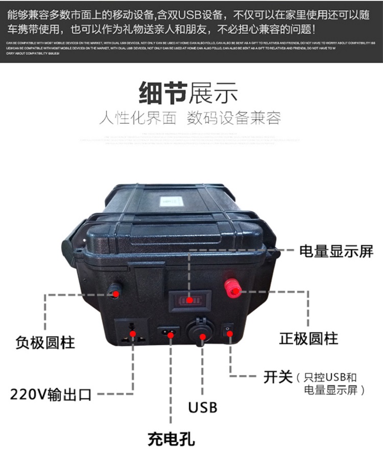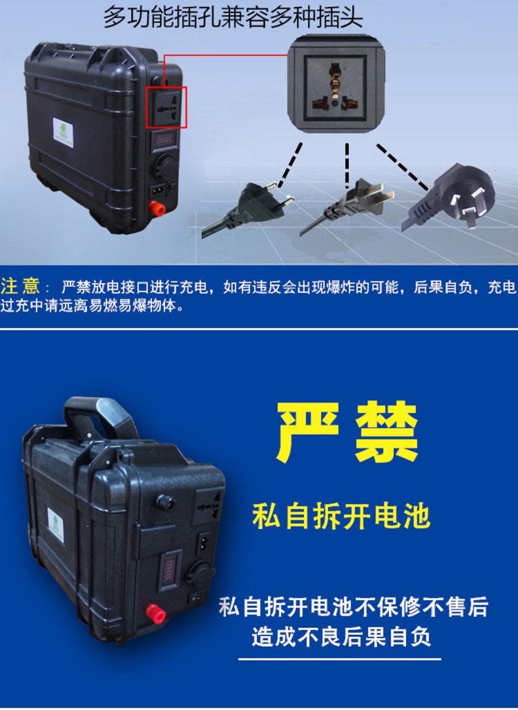 简单介绍:内置三元聚合物锂电池 超大容量 持久续航,进口锂电芯,进口保护板,搭配逆变器使用。优质ABS防震材料,专业充放电接口,更安全,更持久,更强劲...