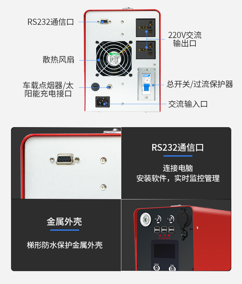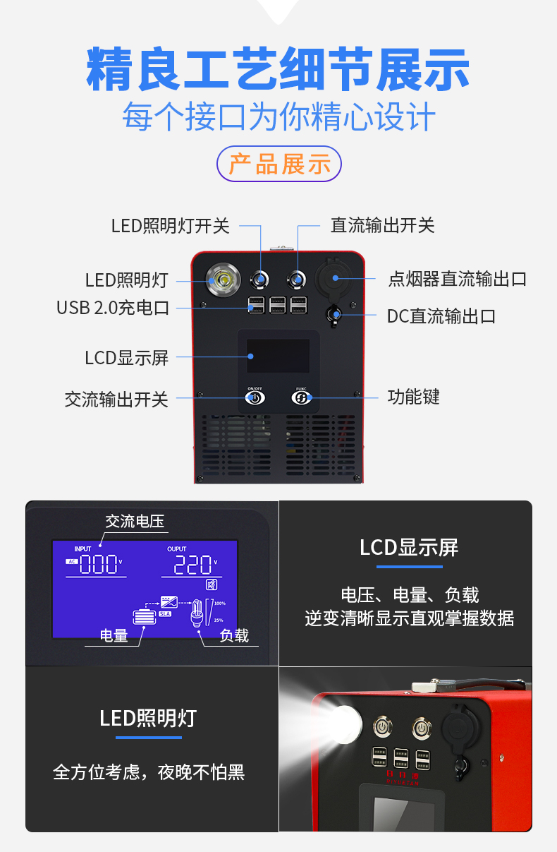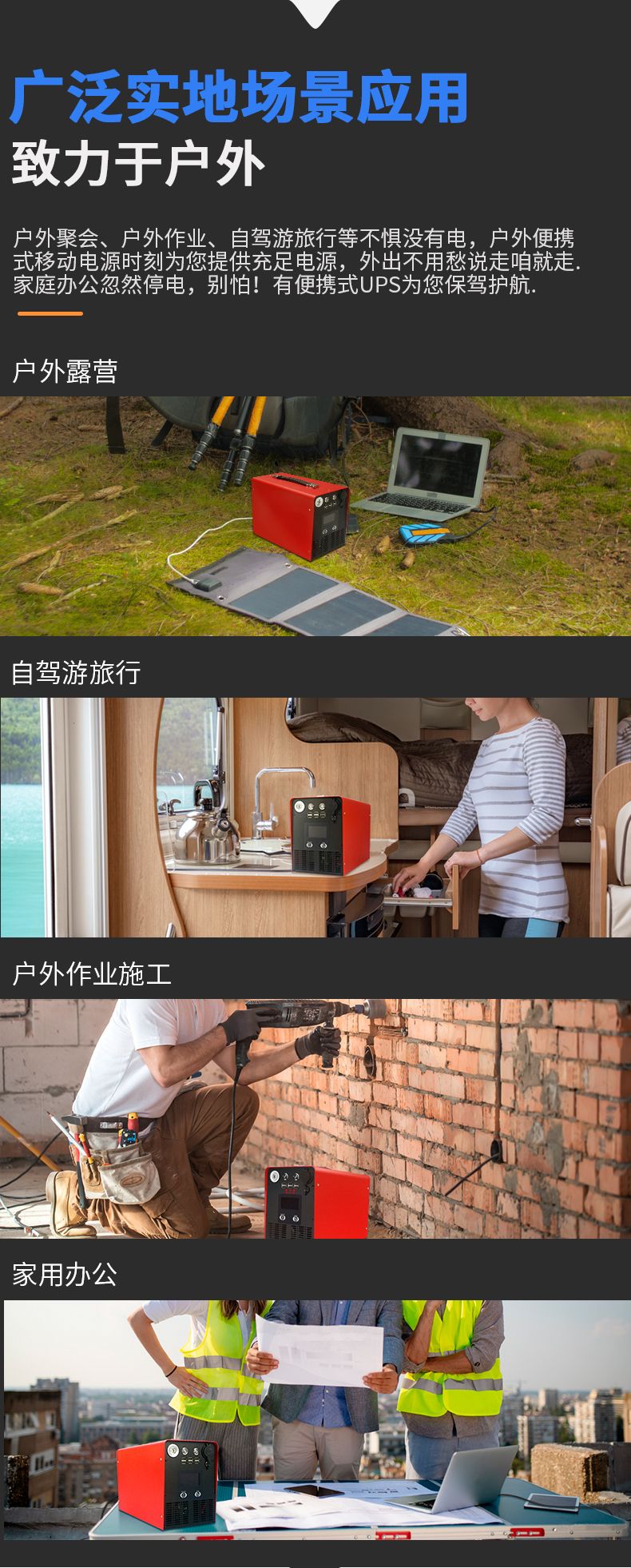大功率纯正弦波输出,支持边充边放,支持太阳能、汽车充电,带有ups功能、屏幕数显,LED手电。适用于电脑、无人机、房车、车载冰箱、户外露营,夜市摆摊等