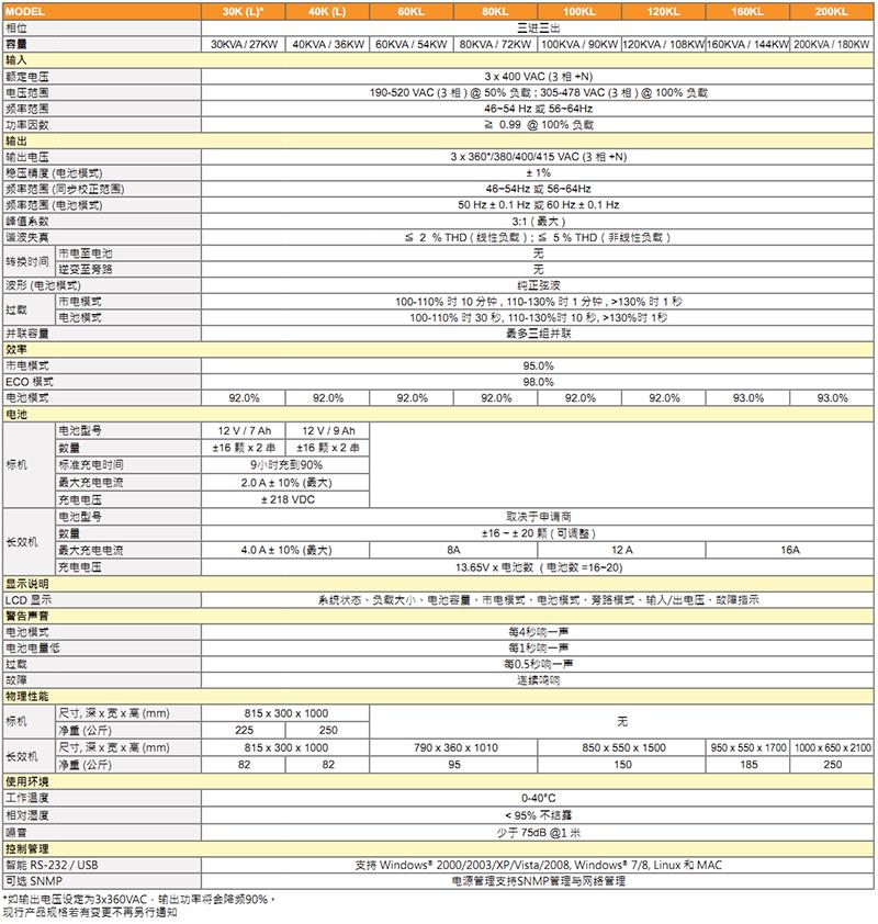 豪门国际UPS电源RYTON-HP 3/3系列产品规格: