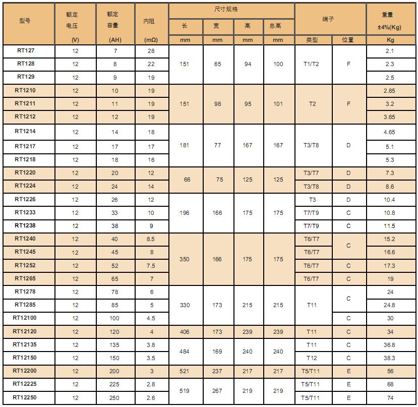 标准AGM铅酸蓄电池RT(6GFM)系列产品型号